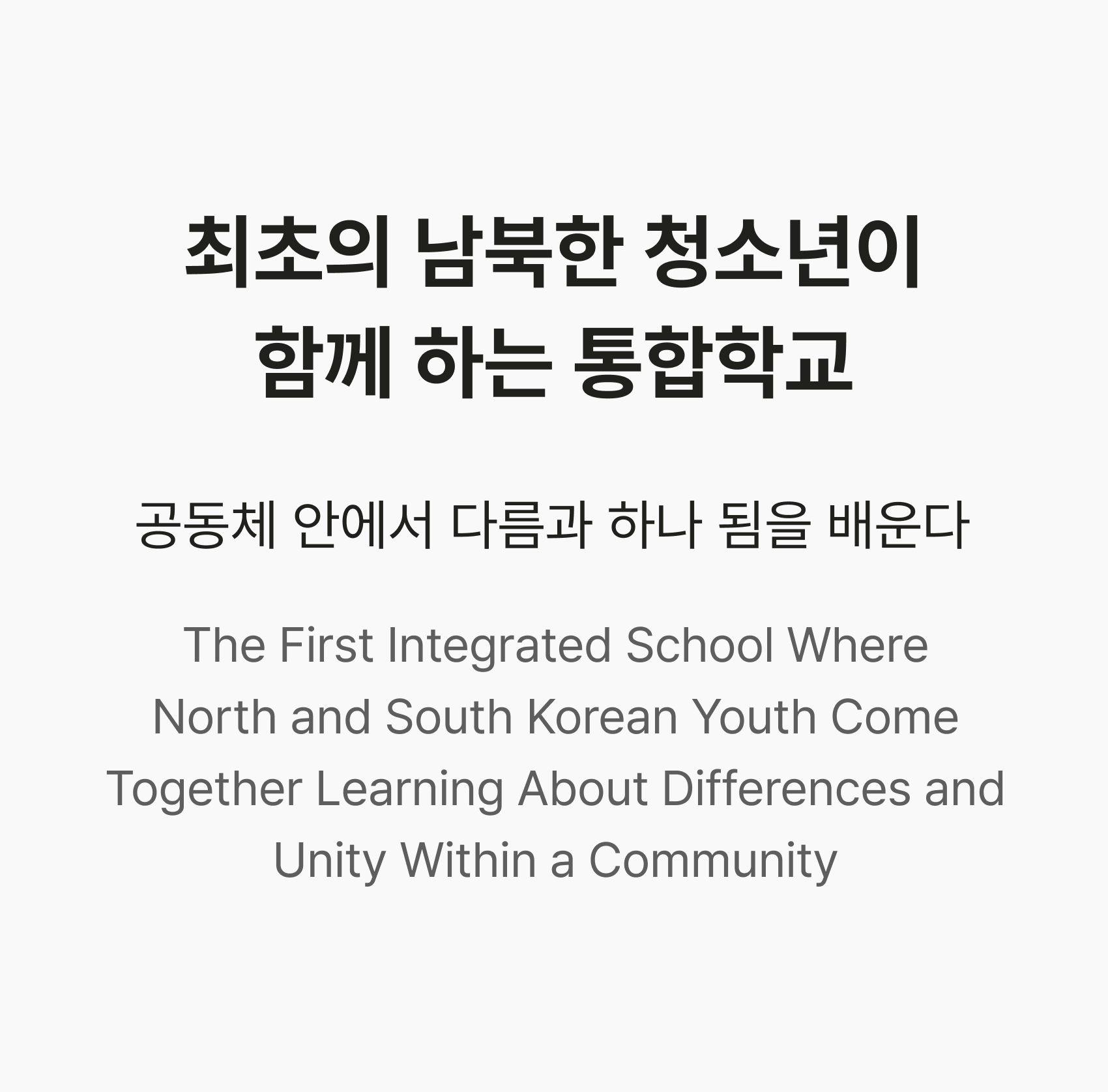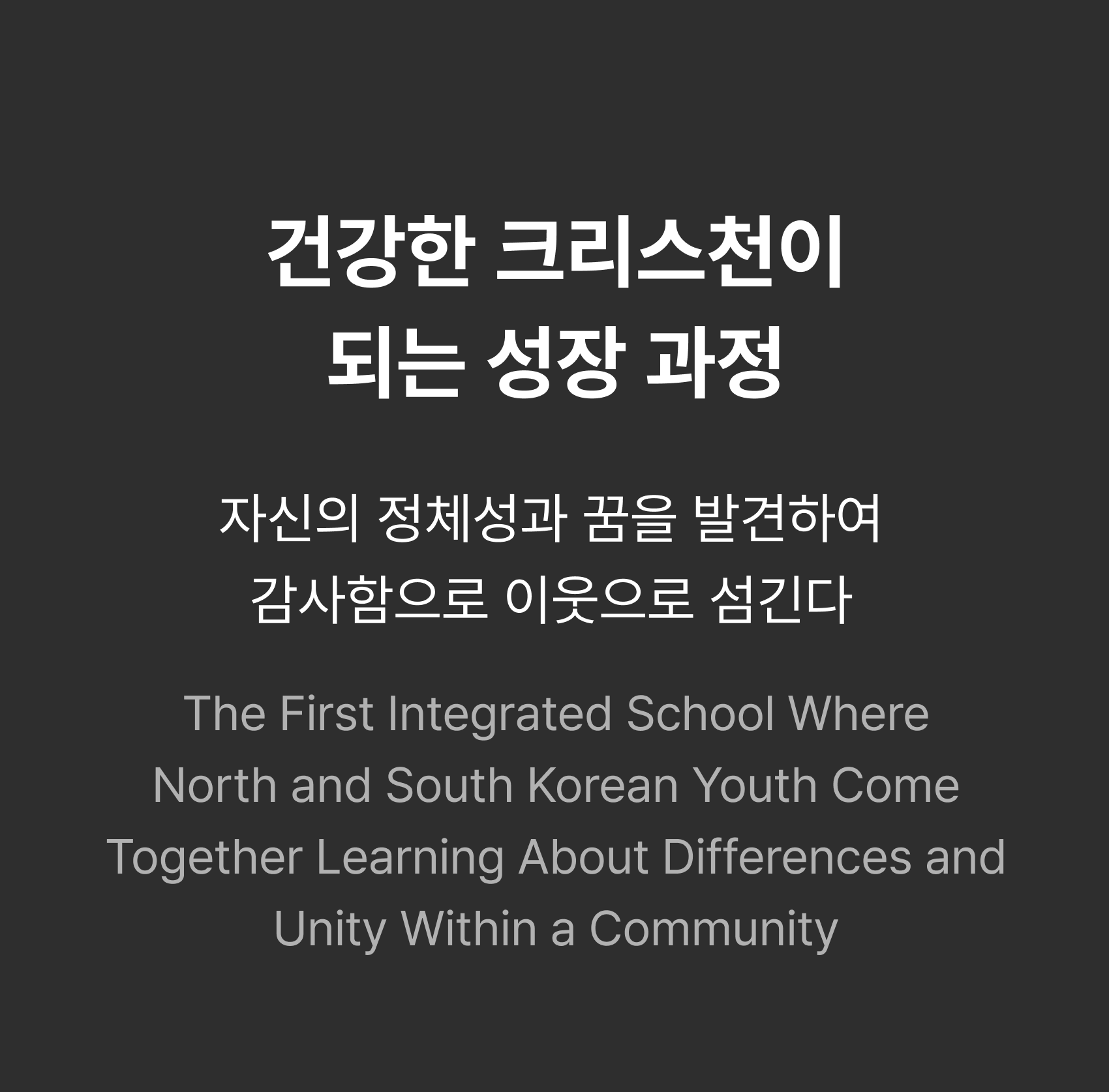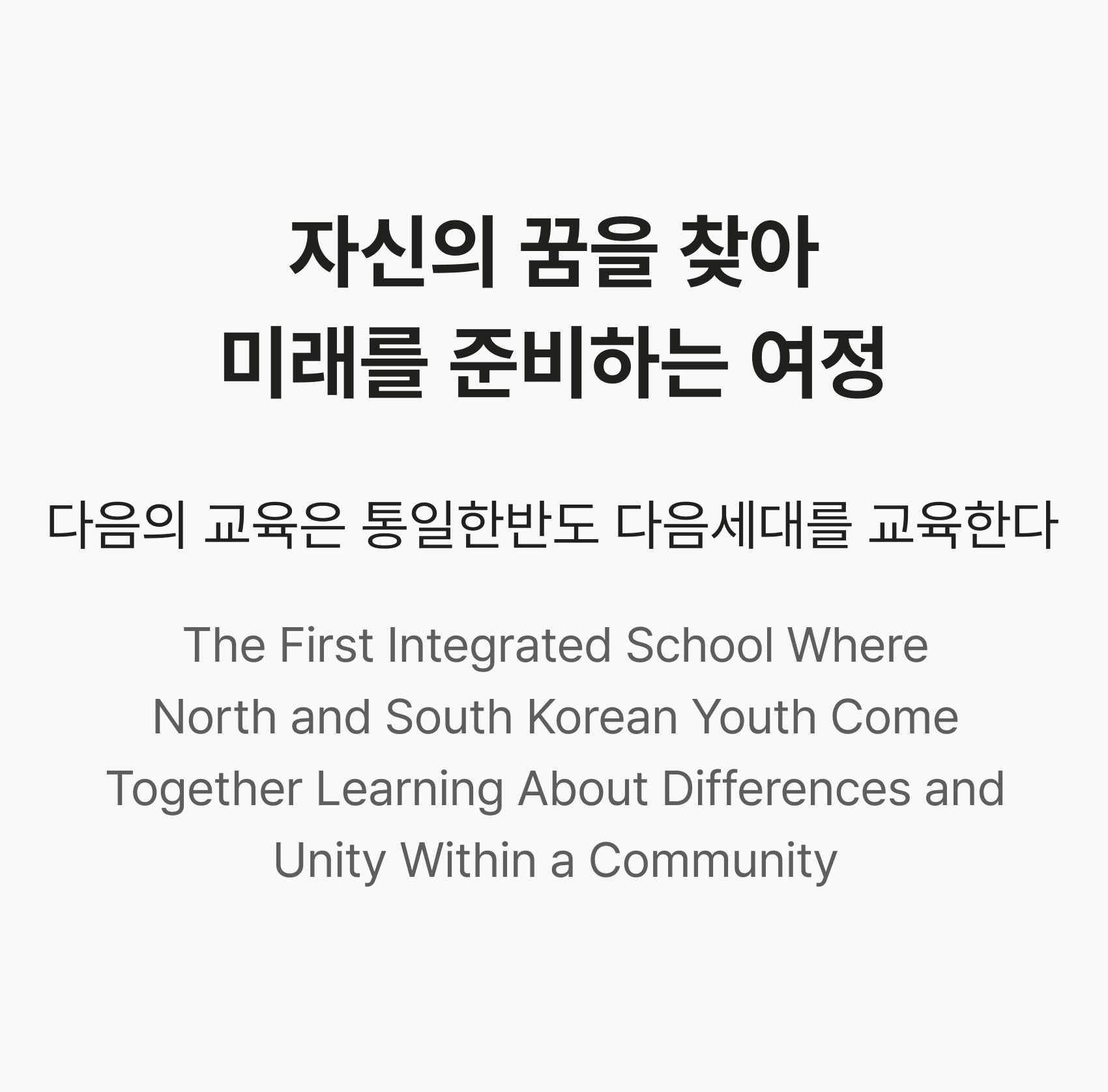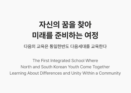 대안교육기관 다음학교는 서로를 이해하며 하나 됨을 배워가는 공동체입니다. 이 여정을 통해, 학생들은 자아를 성찰하고, 꿈을 발견하며, 감사함으로 이웃을 섬기는 건강한 크리스천으로 성장합니다. “다음의 교육”은 역사를 이해하고, 글로벌 시대를 준비하는 통일 한반도 다음세대를 양성합니다